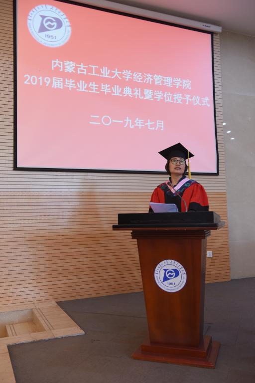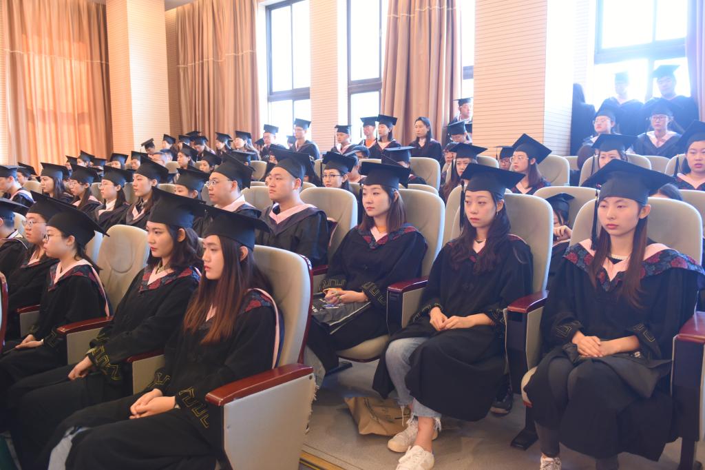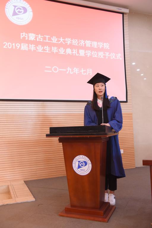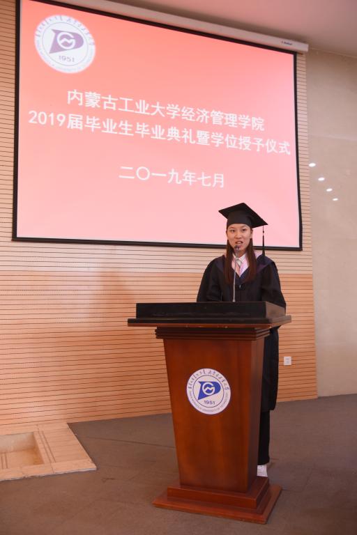 研究生代表周琪发言,她在回忆校园生活和表达依依不舍之情的同时,对学校、学院各位老师的谆谆教诲表示由衷的感谢。她表示,毕业后将勤奋工作、踏实有为,不辜负学校、老师的殷切期望。本科生代表段可可发言,她表示无论日后在哪里,定将秉承学院“博采众长,明德自强。无间改进,止于至善”的院训。做拥有智慧并富有激情的人,做德才兼备并勇于创新的人,做富有责任并敢挑重担的人。不断填好人生履历,为母校增光添彩。教师代表华连连发言。她对毕业生送去美好祝福和提出殷切希望,希望同学们心中有爱,接纳自己,懂得感恩;希望同学们真诚笃定、勇于担当;希望同学们相互扶持,互相成就;希望同学们找准方向,并为之不懈努力;希望同学们持续学习,功不唐捐终入海。