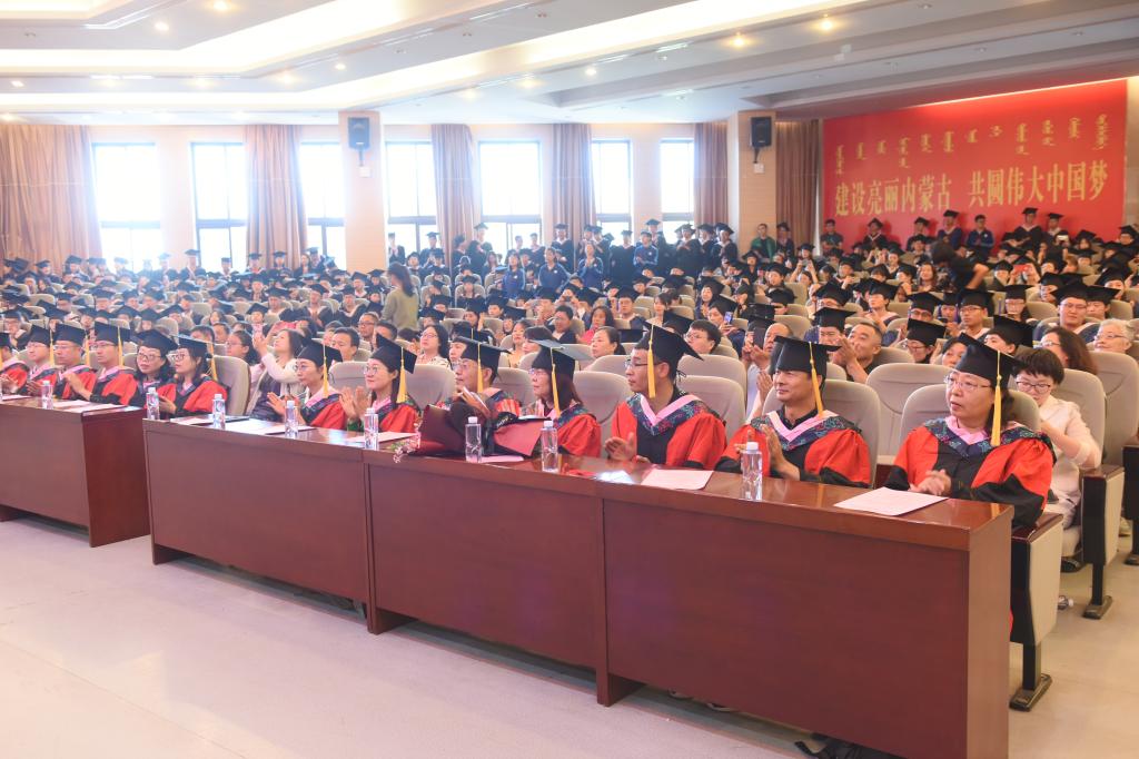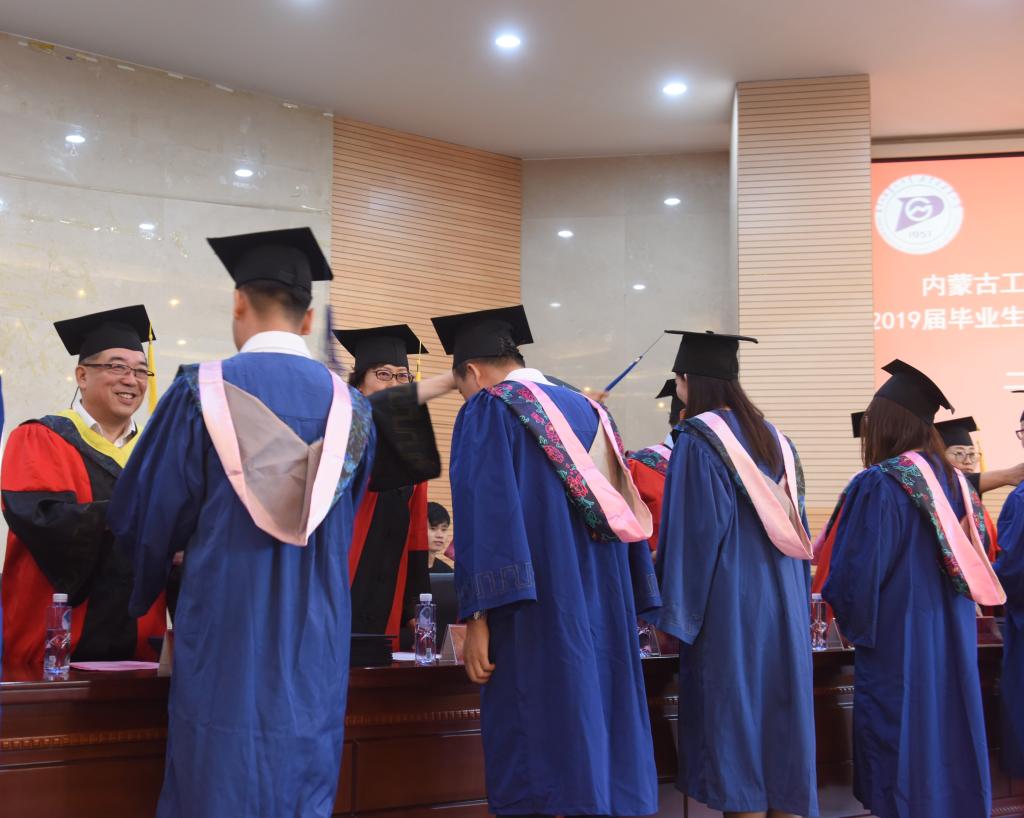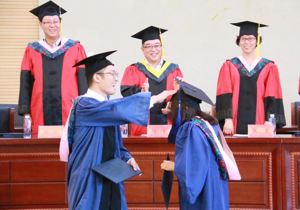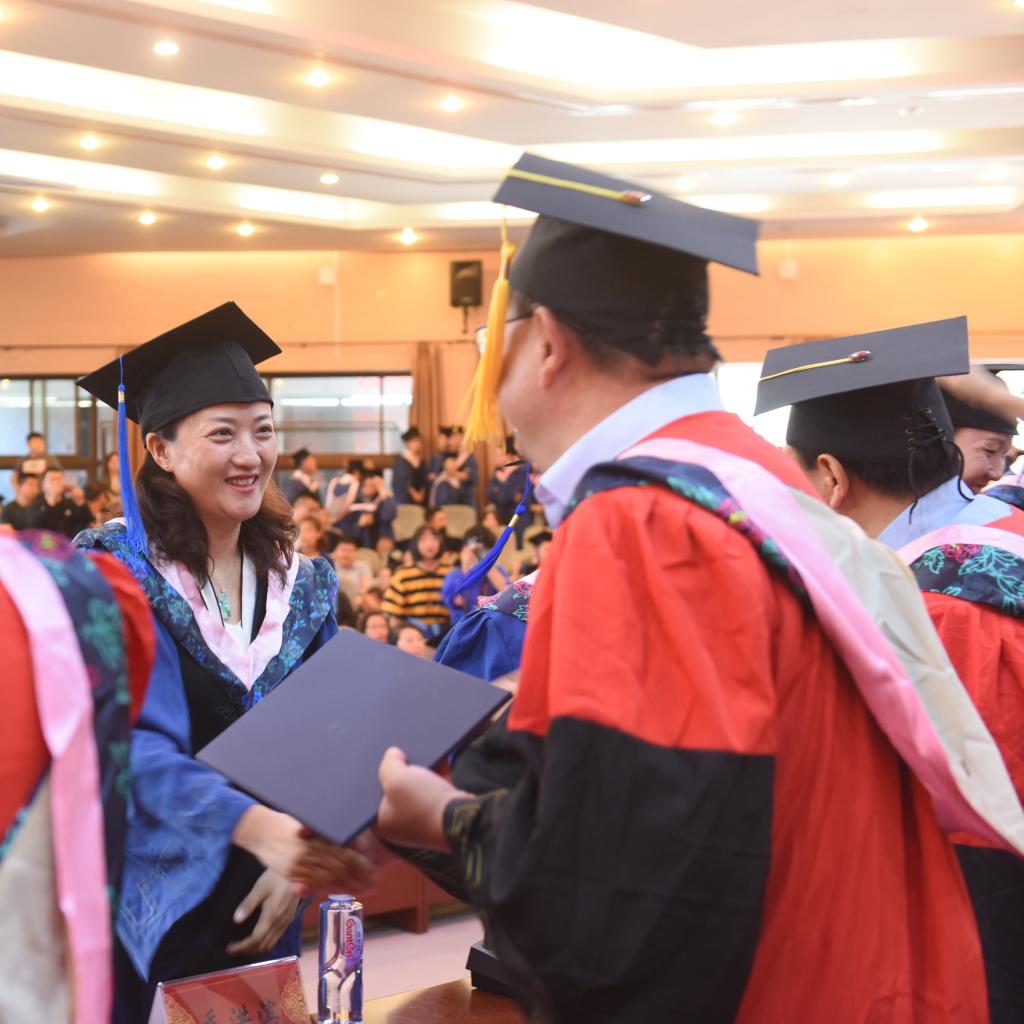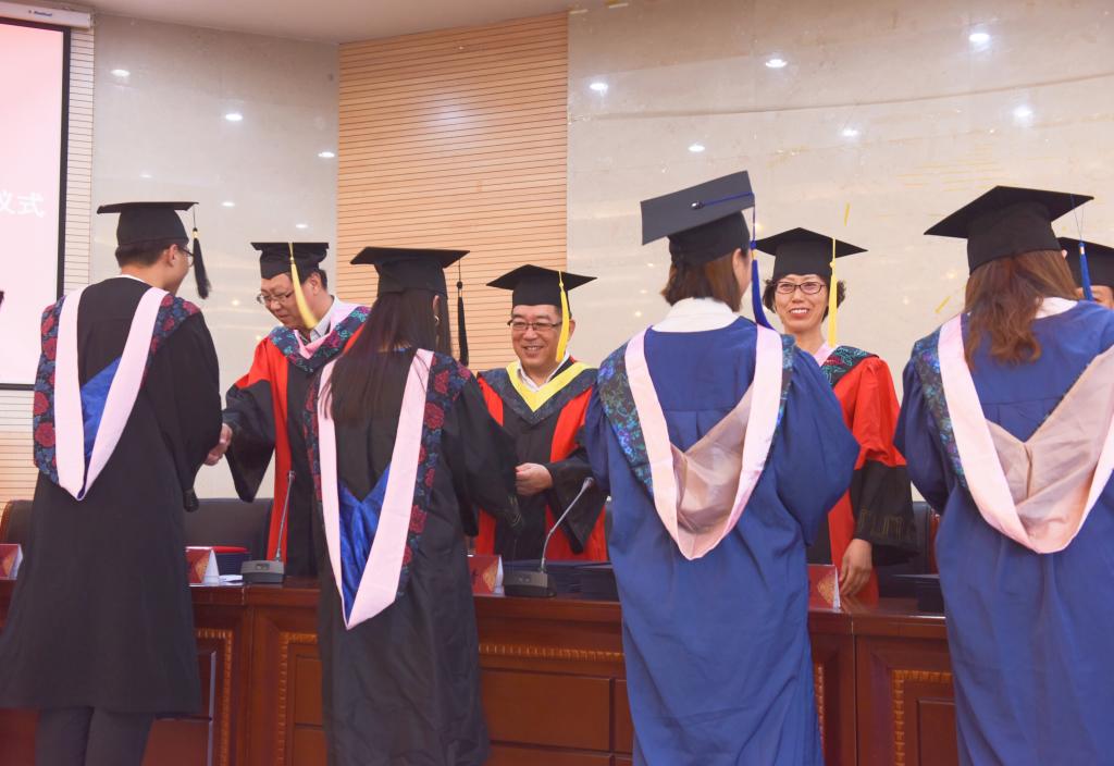 主席台领导、老师为获得校级三好学生、优秀学生干部、优秀毕业生代表颁发获奖证书;为2019届硕士学位、学士学位毕业生颁发学位证书,拨穗正冠,握手合影。
