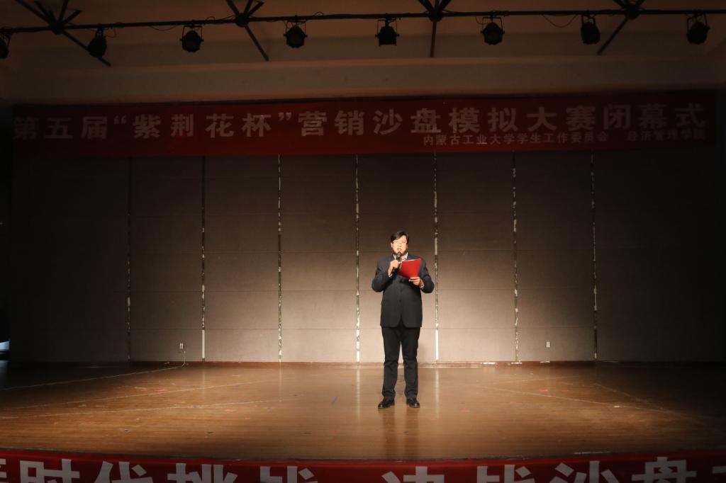 冀强致闭幕词,他向参赛队员和辛勤组织的工作人员表示祝贺和感谢,希望同学们能够从比赛中学习到更多专业知识,丰富自身才学,期望“紫荆花杯”营销沙盘模拟大赛越办越好。